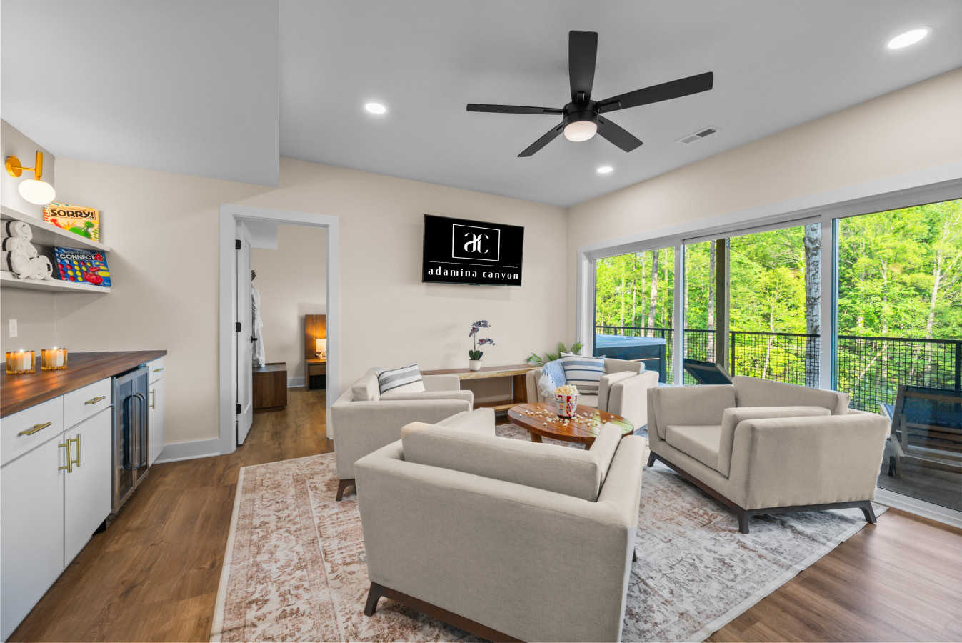 This luxurious brand new villa is nestled in the Heart of Hocking Hills overlooking Adamina Canyon. Experience a Colorado mountain villa right here in Ohio, while enjoying 100 acres of private serenity, vistas & picturesque landscape. With exceptional amenities such as 2 overlook decks, a 7-person hot tub, outdoor dining with motorized bay screens & fans, a propane fire bowl, along with plenty of indoor living space! This Villa offers 4 free parking spots with extra shared parking if needed!